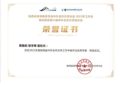 11月29日,由陕西省教育厅主办、陕西省高等教育学会合作办学分会和长安大学共同承办的“陕西省高等教育学会中外合作办学分会2021年工作会暨陕西省第六届中外合作办学座谈会”在长安大渭水校区召开。会议对2021年度陕西省中外合作办学优秀机构和项目及分会专家组的优秀专家进行了表彰。公司与美国亚利桑那大学合作举办的环境科学专业合作办学项目获2021年度陕西省中外合作办学优秀项目奖,国际合作与交流处副处长邹宇锋获陕西省高等教育学会合作办学分会优秀专家称号。