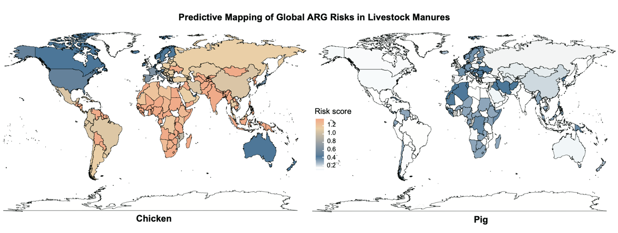 研究综合了 ARGs的移动性、临床相关性以及与病原宿主的关联程度,开发了一种创新的高分辨率的风险评估框架,确定了畜禽粪便中不同ARGs的风险排序。研究揭示了全球范围内畜禽抗性组显著的区域差异,强调了在主要畜牧业国家开展针对性监测与风险管理的紧迫性。通过机器学习分析,揭示了养殖密度、动物与人类抗生素使用情况等在驱动ARG全球分布格局中的关键作用。预测获得的全球畜禽抗性组风险地图,为了解全球畜禽抗性组风险的热点和开展有效监测提供了重要参考。