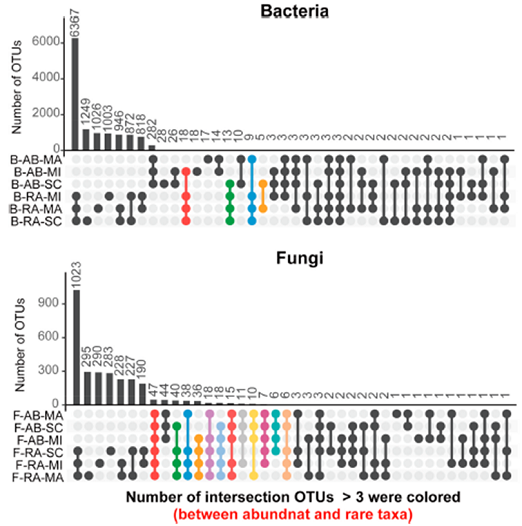 本研究基于英国上市公司365白水苹果试验站的12年长期定位试验,调查了长期不施肥、单施化肥、生草覆盖、生草覆盖配合化肥4个处理下土壤不同粒径团聚体(> 0.25 mm;0.053-0.25 mm;< 0.053 mm)细菌和真菌群落结构,并对细菌、真菌的“丰富”和“稀有”菌群进行了群落装配分析。研究发现在丰富的细菌群落构建过程中,环境选择的重要性从大团聚体到小团聚体呈现增加的趋势。稀有细菌的群落装配过程受同质性选择影响,并且随着土壤有机碳和全氮含量的降低同质性选择的作用逐渐减弱。丰富真菌群落在团聚体中的装配过程主要受随机性过程主导,而稀有真菌群落主要受同质性选择和扩散限制共同主导。研究还发现,团聚体的发育团聚过程使丰富、稀有真菌和细菌群落结构趋于相似,但不同粒径团聚体的环境条件不同又会使其产生各自的独有菌种。而且丰富真菌、细菌可能是团聚体团聚的促进者,而稀有细菌可能是团聚体内功能的“种子库”。该研究为旱地苹果园长期生草覆盖与施肥条件下土壤肥力发育的微生物学机制提供理论依据。