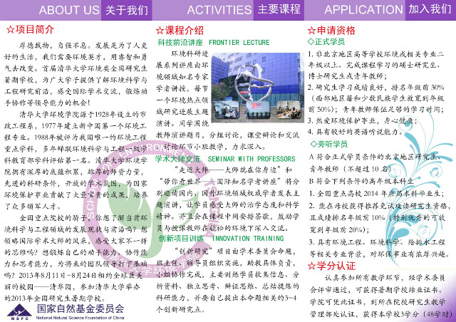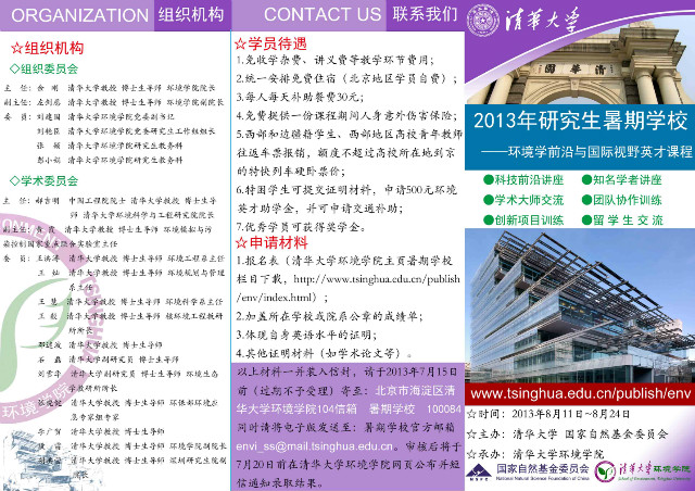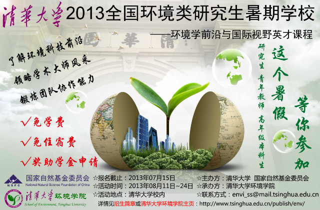 由清华大学和国家自然科学基金委主办,清华环境公司承办的2013将于2013年8月11日~8月24日在清华园举行,现已开始火热报名,欢迎有意向参加的青年教师和员工关注宣传海报和网站通知(http://www.tsinghua.edu.cn/publish/env/6362/index.html),积极报名。