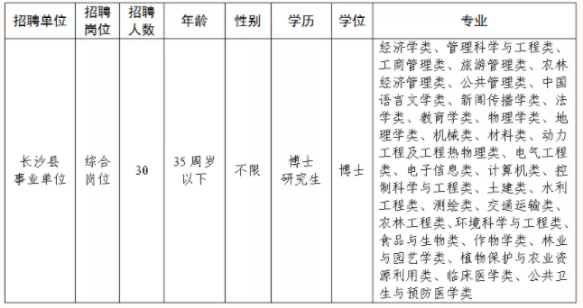 为奋力推进“三高四新”战略,加快打造近悦远来人才高地,为长沙县未来发展储备培养一批高素质专业化人才,根据《事业单位人事管理条例》(国务院令第652号)和《湖南省事业单位公开招聘人员办法》(湘人社发〔2019〕1号)等文件要求,决定面向社会公开招聘30名具有博士研究生学历、学位的高层次人才,现将有关事项公告如下: