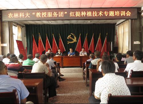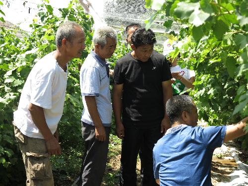 事后,队员们跟随教授团成员分赴合阳各乡镇,协助专家们对果农进行技术指导,开展扶贫调研。葡萄专家张宗勤副教授来到乾落村举办“红提葡萄关键技术培训示范”,与果农建立微信群,方便随时沟通;苹果专家李丙智教授来到甘井镇举办“苹果产业转型升级主要措施培训”;樱桃专家蔡宇良教授来到金峪镇方寨村樱桃基地举办“樱桃夏季管理技术培训”;红薯专家陈越副教授来到黑池镇红薯基地举办“甘薯栽培关键技术培训”;奶蓄专家辛亚平副教授走访金峪镇念吉村贫困户。教授们不仅在会场上为农户们答疑解惑,还冒着炎热酷暑深入到田间地头为农户做现场指导,手把手进行教学。