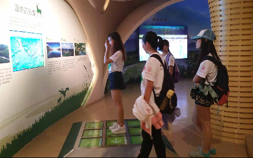 作为西北地区第一个城市湿地博物馆,张掖城市湿地博物馆布展采用了先进的声、光、电控制技术,并配有大量的标本、图片、文字资料印证,凸显了黑河湿地国家级自然保护区的战略地位、地质地貌、自然资源、环境演变及生态保护成就。不仅如此,博物馆的独特展出方式也深深吸引着队员们。为了增强人们对湿地生态环境的保护意识,展馆采用寓教于乐的学习模式,并配有丰富多彩的展示方式,在游戏、观景、实践中将湿地保护知识传授于我们,使大家不仅玩得有趣味,而且学得更扎实。在调研过程中,队员们还向博物馆周边的居民就黑河水资源的发展现状进行了调查,进一步地了解了黑河湿地的发展历程及湿地发展的重要性。