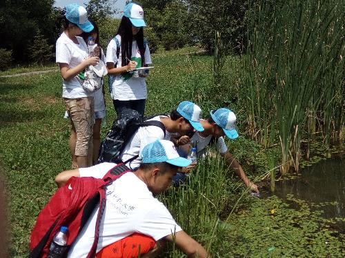 调研服务队首先进行采水样。在选择一片比较安全,适合研究的水域后,队员们将在环保局所学到的理论知识应用于实践,男生们用专业的手法取得多瓶合适的水样,女生则在一旁记录时间、体积、位置等数据。炎热的天气并没有阻挡队员们积极的热情与兴趣,即使有的队员在经过几天的就地考察后,也并未表现出疲惫之感,队员们一丝也不敢懈怠,所取得样品和记录的数据都一一按照要求保存。