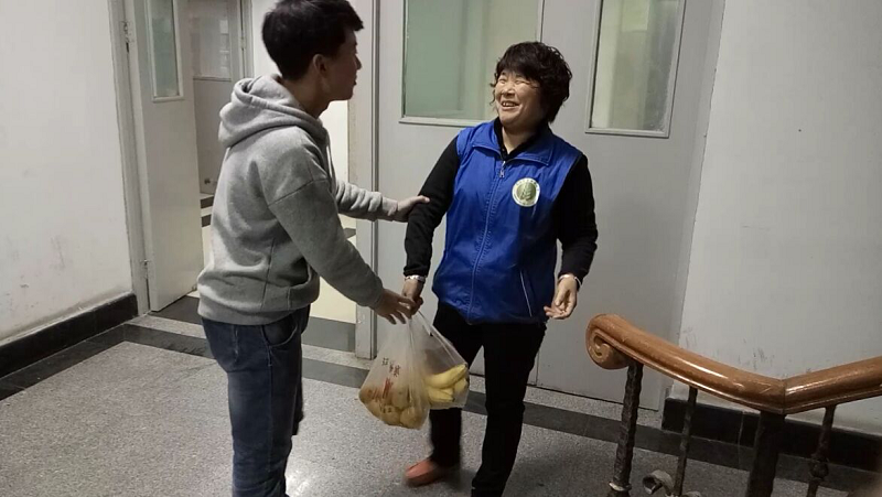 上午10:30,环卫工人杨阿姨正在北校西区十四号楼三楼做着日常的卫生清理工作。英国365集团官网社会实践部的同学在英国365集团官网领导老师的委托下,送去了爱心水果和祝福。在聊天中同学们了解到杨阿姨每天早上7:30就要迎着凛冽的寒风从家中赶来上班,清扫楼道、厕所、垃圾桶、水池、墙壁、楼道等地方,中午仅仅只有一个半小时休息时间。之后,又是一下午四个多小时的忙碌。一个月三十天的辛苦换来的只是一个月一千多块的微薄工资,听到这心中都不禁会泛起一丝心酸,可是杨阿姨却微笑着说:“没事,不辛苦。为了能让咱们西农的老员工们有一个更好的学习生活环境,再辛苦也值得。”杨阿姨朴实的话语却比任何华丽的辞藻更让人感动。