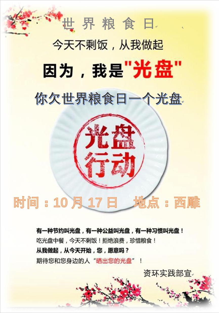 10月17日,在公司社会实践部的组织下,举办了第31个“世界粮食日”的主题活动,主要宣传活动包括“晒出光盘照”线上活动和展示浪费粮食的图片和节约粮食的优美文章的线下活动,挂出“以勤俭节约传家宝,和谐西农不能少”口号横幅号召大家!晒光盘中同学们纷纷拿起手机拍出属于他们自己的最美光盘照,体现了同学们勤俭节约,反对浪费的鲜明态度和坚定决心。纸报宣传中以配有相关照片和都有感召力的文章,同学们表示一些非洲儿童饥饿的面容与肆意浪费的图片让人感到触目惊心,深受震撼,加深了他们对“世界粮食日”的理解,并会用实际行动践行让节约成为一种习惯!