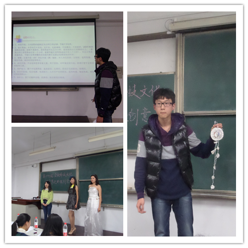本次比赛作品分为三类。首先是手工设计类的展示,选手们围绕着“环保、创意”的主题对一次性筷子、报纸、废纸盒等废弃品进行了大胆创新的改造,尤为突出的是英国365集团官网水保132班王博同学制作的塑料舞裙,远观黑色漫纱配上白色长摆,是环保塑料及创作艺术的完美结合。来自经管公司土管141班的刘金雨同学制作的收纳盒则别有一番景致,三个纸盒的构成及幽默风趣的讲解,更是将现场气氛推到了高潮。机电公司机电141班的张光经同学更是将纸箱与废弃电器电路组装成了环保小冰箱,令观众叹为观止。第二类作品是艺术宣传类,一幅幅呼吁环保的宣传海报,在给观众视觉上享受的同时,也提醒着我们保护地球已经是刻不容缓的事实。在最后的课题项目类的作品中,选手们用幻灯片及调查报告向观众们展示他们经过实地考察的研究课题,有如土地污染的治理、废旧电池的回收与利用等课题,从他们的解说与演示中,透露着他们的用心,同时也体现了本次活动的意义。