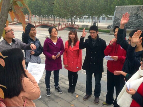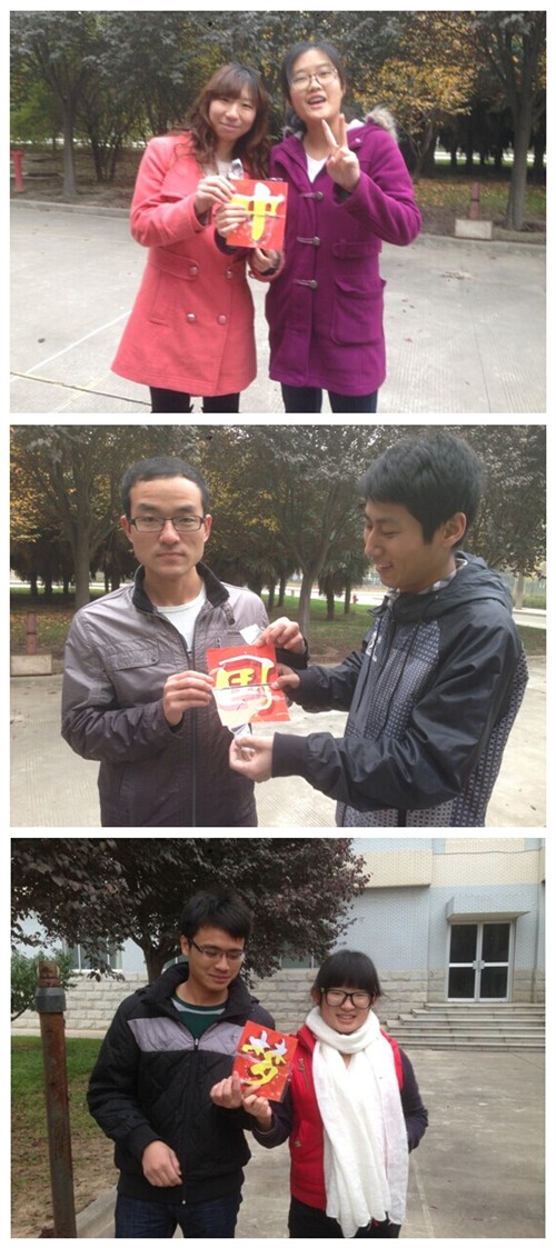 各队员身后贴二分之一“中”、“国”、“梦”字样的名牌,计时一分钟在规定场地内任意挑选一人撕掉其名牌,所得名牌即为自己的队牌,队员最终被分为三组进行猜谜寻信封活动,他们同时从三号楼西侧出发,跑至南绣山活动中心门口,每队找到一枚信封获得信封内的谜题,各队猜出谜底后迅速跑至谜底指示地点(3208)领取新的任务卡,各队员分别在苦楝广场、图书馆、南校区大门口向同学们讲解“中国梦”指导思想,让大家深刻了解中国梦内涵:实现国家富强、民族复兴、人民幸福、社会和谐。