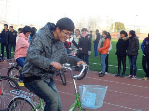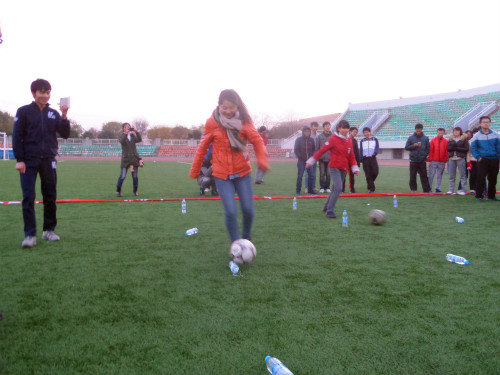 在主持人和裁判的安排下,比赛紧张有序的进行着。无论是个人赛自行车慢骑、踩石头过河;还是团体赛并肩前行、齐心协力、足球过杆、袋鼠跳,场上的运动员都积极认真,场下的观众氛围也是格外热烈。自行车慢骑比赛中,同学们为了放慢速度又保持平衡,七扭八歪地前行,让加油助威中夹杂着阵阵欢笑声。并肩前行比赛中,12名男生女生也没了往日的羞涩,紧紧抓住彼此的手向前狂奔。这样的趣味让大家在初冬里抛却了寒冷、燃起了“三走”的热情。