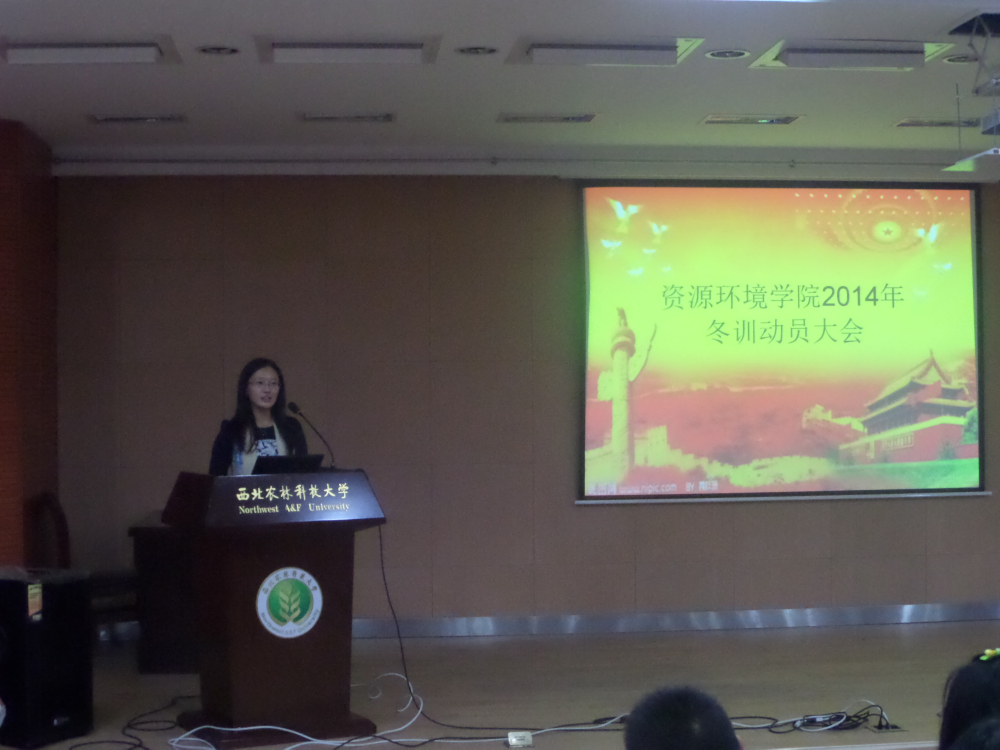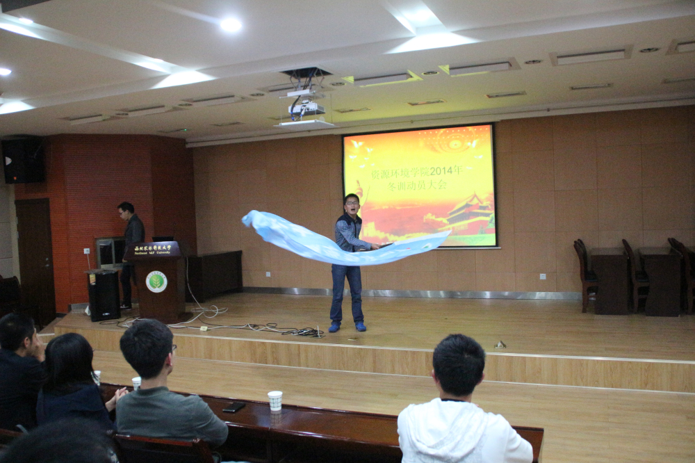 紧接着,由2009级资环田径队副队长赵勇学长进行动员讲话,赵勇学长向全体队员诠释了资环田径队“诚实友善,自信乐观,严肃活泼,刻苦训练,我思我在,知行合一,励志笃行,自强不息”的队训,对训练提出了新的要求,更提高了2014级新生对冬训的认识。