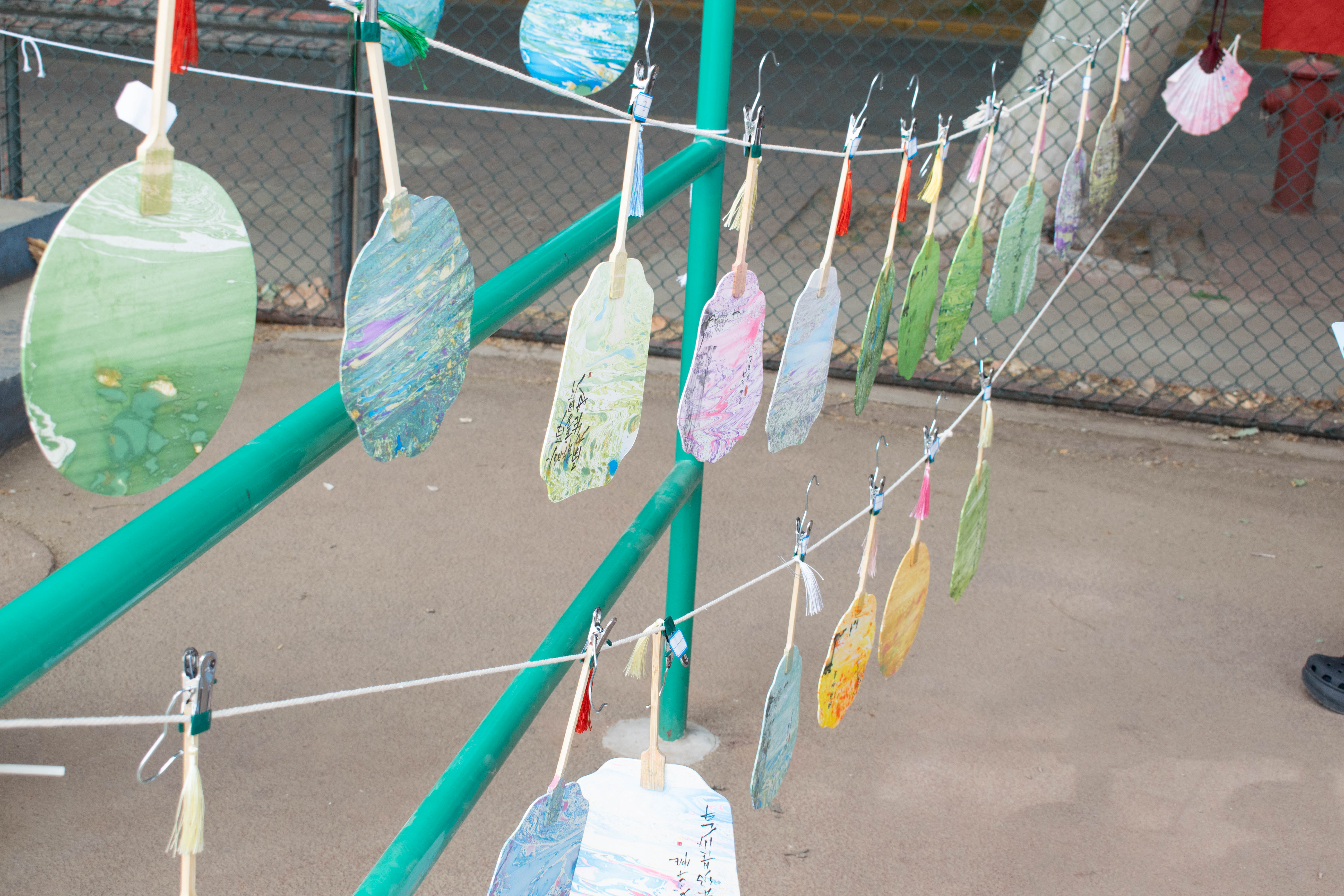 活动伊始,先由研究生会权益心理部负责人张艺轩向大家介绍了漆扇的历史渊源及制作方法。随后,同学们挑选喜欢的扇子形状,纷纷发挥创意,运用不同的手法和颜色开始制作漆扇。有的同学以靛青打底,碧水青山尽浮于扇上;有的同学则偏爱粉色与紫色,在瑰丽与神秘的交织间,用鲜明的色彩对比展现出别具一格的风格;更有即兴创作的抽象派图案在漆液中自由舒展。扇面轻荡,原本素白的扇面已然蜕变为独一无二的作品。王欣如同学表示:“当漆液在扇骨上流淌,那些被学业压力、人际烦恼揉皱的心事,都随着指尖的温度慢慢舒展,看着空白扇面一点点变成作品,获得了强烈的成就感。”在等待扇子晾干期间,还安排了趣味游戏环节,促进同学们之间的交流与合作。活动结束后,同学们拿着自己制作的精美漆扇拍照留念,脸上洋溢着自豪与喜悦。
