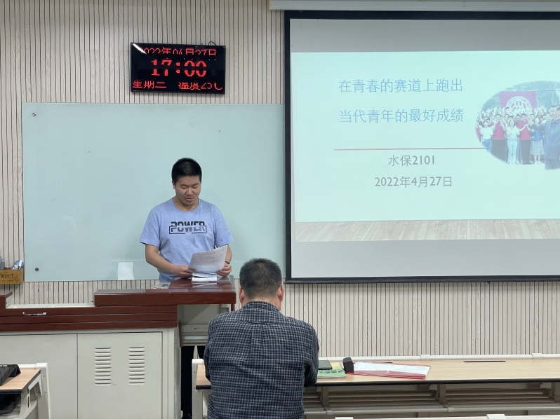 为弘扬“五四”精神,在建团百年和“五四”运动纪念之际,水保2101班召开以“在青春的赛道上跑出当代青年的最好成绩”为主题的班会。班主任薛智德带领同学们重温了五四运动的历史过程,学习“五四精神”——“忧国忧民、热爱祖国、积极创新、探索科学的爱国主义精神”,学习习近平总书记考察中国人民大学时重要讲话和对当代新青年的寄语。