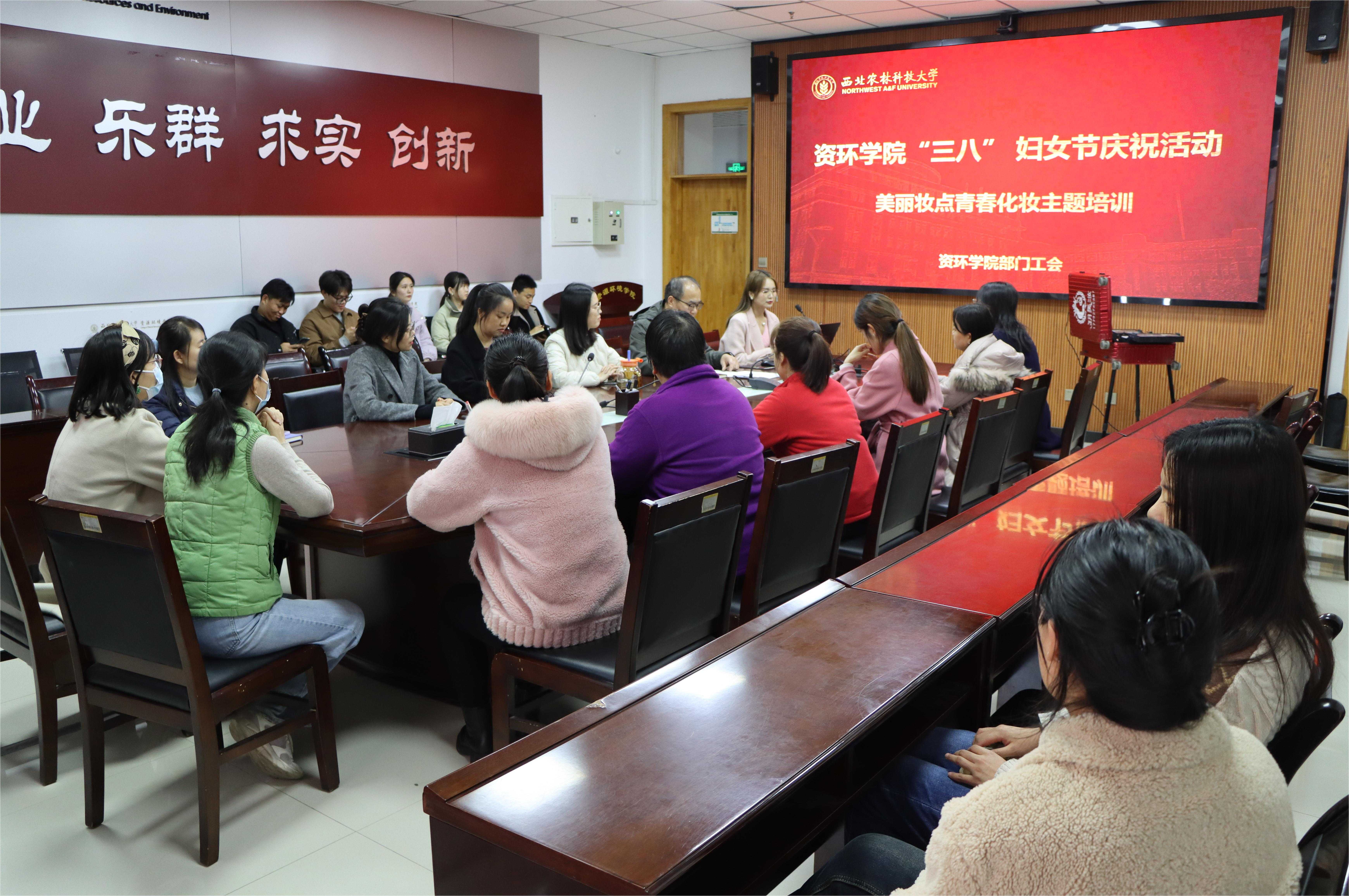 活动开始前,许多女教工就在资环楼307会议室门前等待,兴奋与期待写在她们的脸上。待大家落座后,化妆师打开她琳琅满目的化妆盒,并请了一位女教工做模特,为大家讲解职业妆的画法技巧与步骤。从额头到下巴,从洗脸到护肤,从描眉到画唇,从腮红到定妆,化妆师的指尖在模特的脸上打圈,每一步的技巧与画法在模特脸上展现。互动时,化妆师幽默的言语,引发的笑声在会议室回荡。