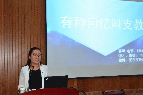 郭璋同学为公司2011级环境工程专业本科生,在校期间品学兼优,曾担任公司团工委副书记。2015年毕业时入选公司第十七届研究生支教团志愿者,任教于陕西省渭南澄城县王庄镇刘家洼公司。支教以来,出色完成所有教学工作,被评为刘家洼公司“星级教学能手”。她策划实施“关注留守儿童,爱心点亮微心愿”系列活动,发动各界力量募捐,搭建起外界联系援助贫困员工的平台。《中国青年报》、《西安晚报》等多家媒体对她的事迹进行专题报道。2016年被授予渭南市五四青年奖章。她带来的支教经历分享,用一个个感人至深的故事,引发同学们对青春的意义、人生的价值、爱心的力量进行思考,大家产生了强烈的共鸣。