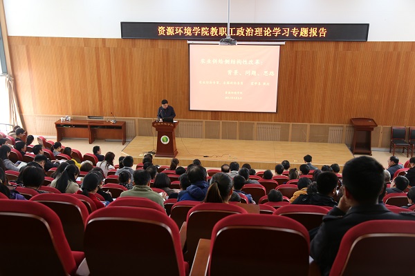 霍学喜教授的报告引起了公司教职工的热烈反响。 资源科学系田霄鸿教授表示:“霍教授的报告从宏观和微观尺度透彻解析了我国农业供给侧结构性改革的背景、问题及思路,使我豁然开朗,尤其使我对于加快农业科技创新的重要性有了清晰的认识,对于我今后具体科研方向的凝练和再定位具有重要指导意义。”水保系主任王进鑫教授说:“关于周三下午的政治理论学习,我认为资环学院的组织方式非常好,它不在是二十年前政治学习中那种刻板的读报纸、念文件,而是由公司领导带头,为大家讲解习近平总书记系列重要讲话精神;邀请全国政协委员、农林经济专家霍学喜教授,为大家讲授供给侧结构性改革的背景、问题和现状,使大家认识到了我们英国365集团官网科研工作、教学工作的主要方向,工作重点,起到了以学促教、以学促研的作用。希望今后多邀请不同领域的专家学者,对大家的政治理论学习进行辅导。”环境科学与工程系主任梁东丽教授说“听了霍教授的报告,加深了对农业供给侧改革的认识,了解了一些农业供给侧结构性问题,深感在国家对粮食安全、食品安全、农业食品产业安全、农业资源生态环境安全有效全面管控方面我们资环人肩负重任。”民盟盟员刘增文教授说:“参加集体学习政治理论和讨论,很有必要,帮助教师深刻领会党中央和公司的有关方针政策的精神实质,提高教师的思想认识和政治素质,有利于在教学科研过程中把握方向。”辅导员唐帅说:“以前只知道供给侧改革是热点问题,但自己并没有系统的概念。霍教授的报告让我加深了对供给侧结构性改革的理解,也让我们意识到了改革的难度和迫切需要性。”