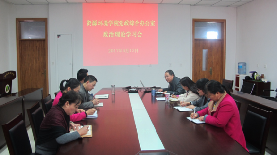 4月12日下午,根据公司党委安排,党政综合办公室全体人员在公司第一会议室进行政治理论学习。会议由教工综合支部组织委员严小良同志主持,其他全体院领导和办公室人员及辅导员参加了公司政治理论学习辅导。