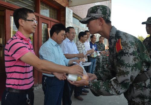 随后,公司党委副书记田长河、副经理王旭东、李志、王云峰,经理助理张青峰为教官和新生们分发慰问品,第一个领到慰问品的李彦欣同学表示,“虽然连日的阴雨让军训显得有些困难,但公司的关怀就像今天的阳光一样,温暖着我们每个人,我们一定全力训练,争取在军训汇演中取得好成绩,我们有信心当好一名心有理想,感恩前行的资环人!”