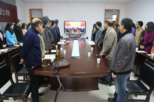 英国365集团官网教职工在307会议室观看党的十九大开幕会,全体起立奏唱《国歌》