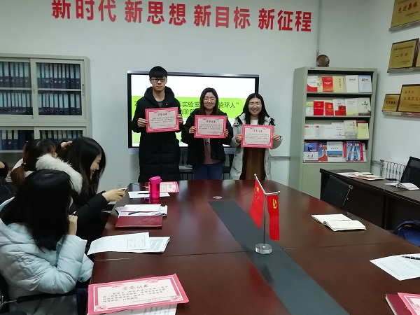本次活动分为两个阶段,第一价段2018年11月1日- 2018年 12月30日,第二阶段2019年1月1日- 6月30日,项目负责人为杜泽坤(支部书记)、郭雷(组织委员)、吉冰洁(宜传委员)。每阶段评比一次,表彰文明实验室及先进个人,发放“文明实验室”“卫生先进实验室”“先进党员”“先进积极分子”等奖状及奖品进行鼓励。
