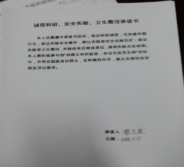 支部全体党员、入党积极分子签订《诚信科研、安全实验、学习室实验室卫生整洁承诺书》;研究生党员佩戴党徽,亮身份,树形象。