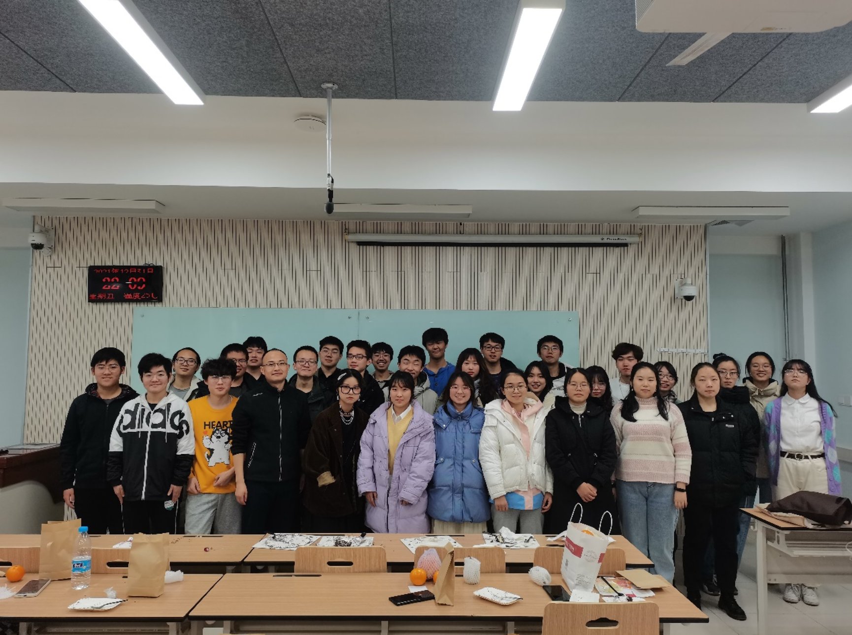 之后进入核心环节,由宣传委员组织同学们手写祝福,交换信件,互相传递新年美好心愿,同时,大家共同分享蛋糕与水果,露出欣喜的笑容,同学们的精神风貌得到良好展示。而后,由班主任作总结发言,他强调了本次活动促进班级集体和谐建设的主旨,同时强调疫情时期要坚持疫情常态化,紧接着为班级同学送上期末及新年祝福,传达持续的关注与关心。活动的最后,班级全体成员进行了合影拍照作为留念,跨年班会圆满结束。