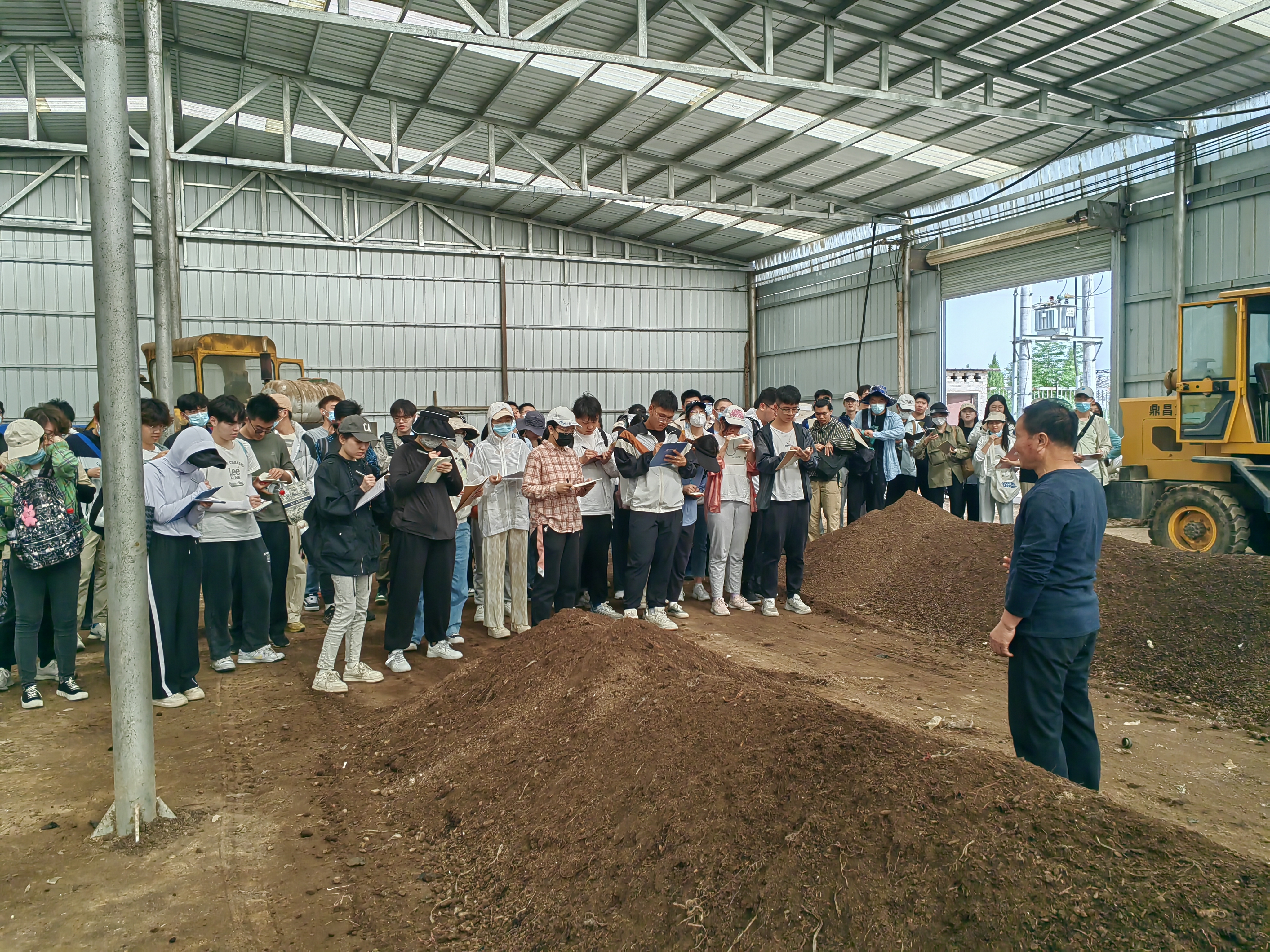 在老师们的带领下,同学们来到了堆肥区域,合作社负责人张师傅介绍了堆肥的原料,不同原料的占比,调节堆肥水分需加入的物质,高温期温度与时长,腐熟期长短,腐熟的质量等。通过张师傅的讲解,同学们对生物处理农业废弃物--堆肥处理有了更直观的了解,真正做到了将书本上的知识与实际相结合。