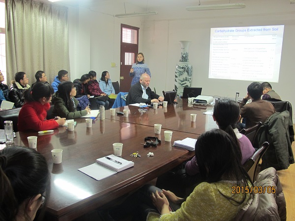 报告会上,Yakov Kuzyakov教授首先向大家介绍了哥廷根大学概况以及课题组的研究方向和内容。随后Yakov Kuzyakov教授向大家做了题为“Competition between roots and microorganisms for N: Mechanisms & ecological relevance”的学术报告,主要展示了植物根系生长过程和微生物在氮素营养元素利用上的竞争机制。此外,Yakov Kuzyakov教授还为大家带来题为“Publish or perish: Scientific writing and publishing: Publish in international journals”的论文写作相关的指导,对在场师生都有所启发,反响热烈。同时,哥廷根大学农业土壤科学系博士生Gunina Anna通过大量的文献阅读与整理,做了题为“Sugars in soil: review on sources, content and fate” 的学术报告,为大家清楚的概述了土壤中糖分的来源、成分及与去向等问题。现场学术氛围热烈,与会师生就感兴趣的内容与其进行了交流探讨。