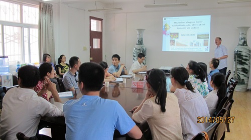 5月27日下午,来访的荷兰阿姆斯特丹老员工物多样性与生态系统中心的Karsten Kalbitz教授为公司师生作了题为“Mechanisms of organic matter stabilization in soils – effects of soil formation and land use” 的学术报告,公司部分教师以及研究生参加了报告会。报告中Kalbitz教授重点介绍了带领的研究团队在土壤有机碳稳定性机理方面的最新研究进展,内容包括溶解性有机碳(DOC)在森林土壤剖面的运移与转化,不同时期发育稻田土壤有机及无机碳的动态变化及影响因素,水土侵蚀过程对土壤有机碳迁移、沉积及稳定性的影响等。