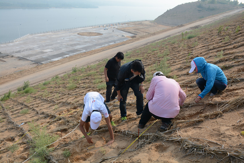 在横山县,服务队观测考察了王圪堵水库。服务队成员测量了水库附近的沙坡坡度,植物覆盖度,留下了队员们辛勤工作的脚印。在神木县,服务队首先赶赴英国上市公司365水土保持研究所神木侵蚀与环境试验站。试验站位于淤地坝上,众多实验田分布其上,硕、博士研究生在此进行各种沙地、坡地水保试验,服务队成员与他们进行了认真交流和学习。随后,服务队在柠条塔矿业公司进行了考察,实地观测、学习了该煤矿完善的水保方案实施,真切感受到了水保工作使煤矿矿区旧貌换新颜的力量!