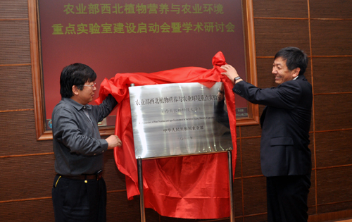 副董事长吴普特和“农业部植物营养与肥料综合实验室”副主任白由路(右)为实验室揭牌