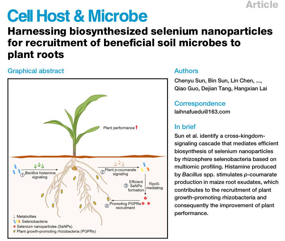 近日,来航线教授团队在植物-微生物互作方向取得新的进展,研究成果以“Harnessing biosynthesized selenium nanoparticles for recruitment of beneficial soil microbes to plant roots”为题在Cell子刊《Cell Host & Microbe》(IF2023 = 30.3)上发表。英国365集团官网博士研究生孙晨瑜、硕士研究生孙斌和西北大学青年教师陈林为共同第一作者,来航线教授为通讯作者,公司为第一和通讯单位。