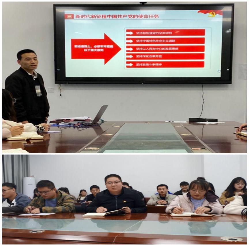会议伊始,研究生农资专硕二党支部书记朱陇强做专题宣讲,他围绕“一个中心任务”“两个确立”“三个务必”“四大着力点”“五项‘重大原则’”“六个‘必须坚持’”等关键词进行了深入宣讲,他认为学习党的二十大精神是目前两支部最重要的学习任务。研究生农资专硕一党支部书记胡昌录分享自己三次学习党的二十大精神的相关体会,他表示每次学习均收获颇深,党的二十大报告内涵丰富,对支部建设,党员理论学习有重要指导意义。