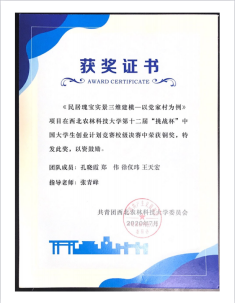 该项目首先以陕西省韩城市党家村为例进行了系统开发。《党家村实景三维建模》先后荣获2020全国三维数字化创新设计大赛校赛一等奖、陕西赛区老员工组(数字人居大赛)一等奖。