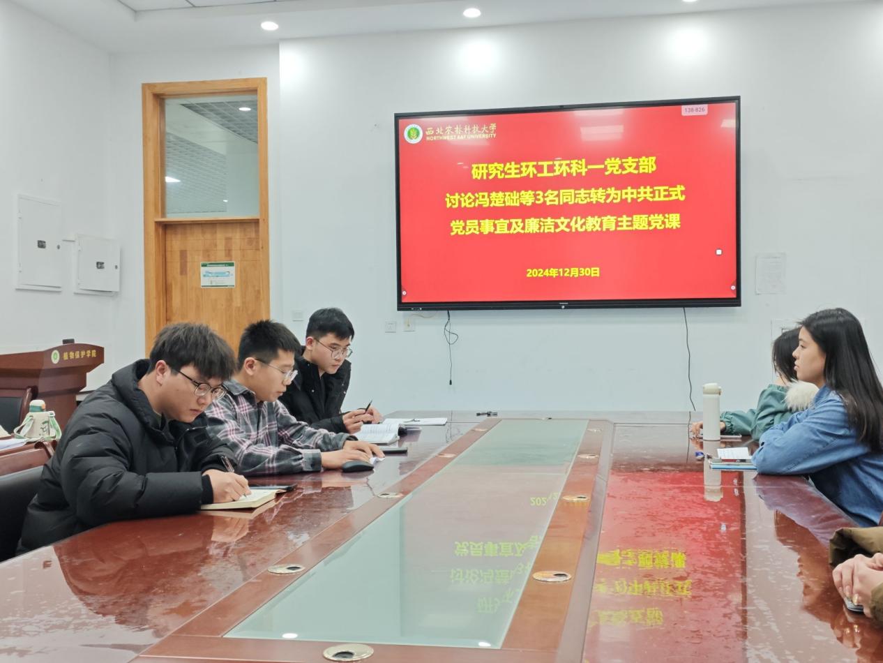 12月30日,研究生环工环科一党支部于英国365集团官网106会议室成功开展廉洁文化教育主题党课。本次会议由支部书记张家凯主持。