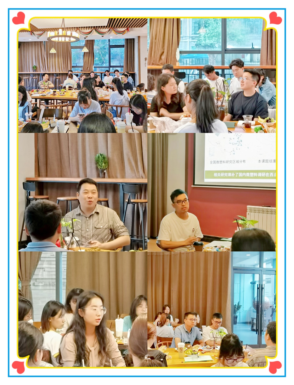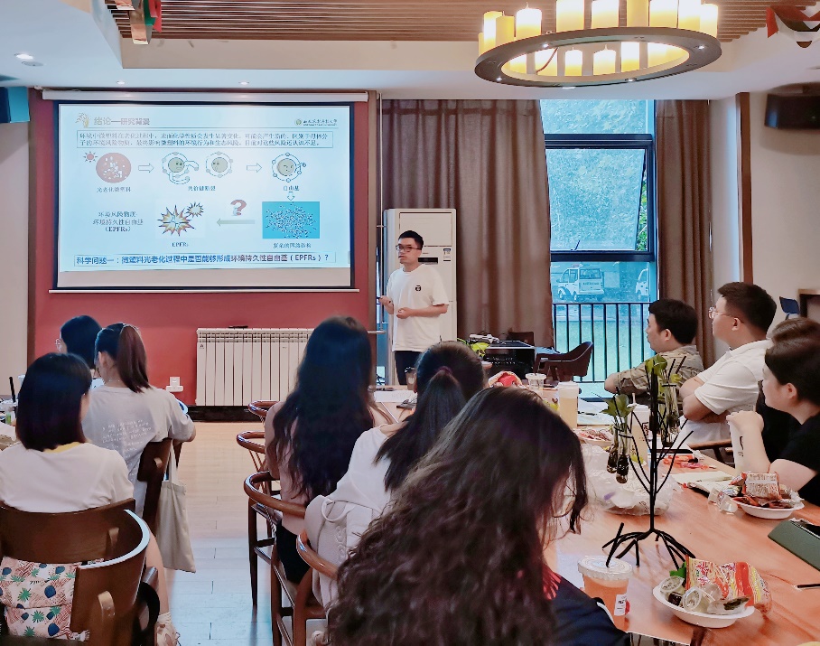 祝可成老师以“光老化微塑料中环境持久性自由基和活性氧(氮)的形成机制及其潜在毒性”为题深入介绍了博士期间的研究工作,报告指出环境持久性自由基及不同活性物种的产生与微塑料分子结构有重要关系并率先发现部分光老化含氮微塑料样品可形成持久性氨基氧自由基和活性氮,引发了师生的热烈讨论。在场很多同学表示以往考虑光老化微塑料的影响机制时往往习惯从碳氢塑料聚合物出发,而含氮微塑料区别于常见的碳氢微塑料常被忽视,祝老师的报告启发了他们科研工作的新思路。