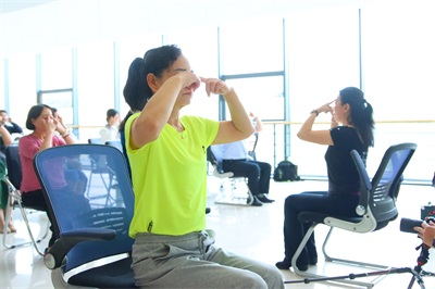 高颖晖副教授介绍了《办公室椅子操》的编排思路及健身功效。《办公室椅子操》主要是针对不同性别、年龄的办公室人员及长期伏案工作的教师,通过按摩、拍击部分穴位、身体的伸拉及跑跳运动各形式相结合,达到提神醒脑、缓解疲劳、放松身心、有效预防职业病的效果。